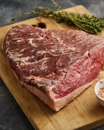 Brisket is a cut of meat from the lower breast or pectoral muscles of a cow. It is a large, tough cut of meat that is full of connective tissue. This is why it is best suited to slow and low cooking methods, such as smoking, braising, or roasting.