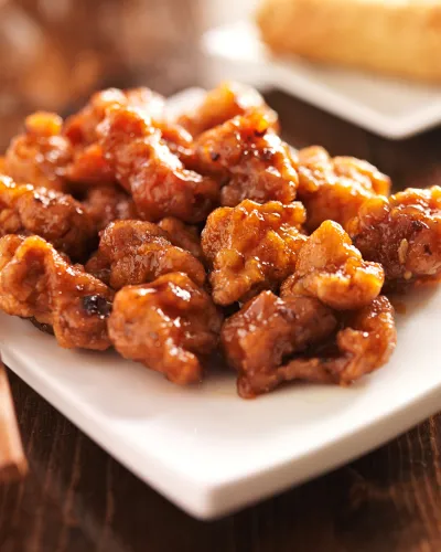 Orange chicken is a popular American Chinese dish made with crispy fried chicken pieces coated in a sweet and tangy orange sauce. The dish is typically made with boneless, skinless chicken breast or thigh that is cut into bite-sized pieces and dredged in a flour mixture before being fried until golden brown and crispy. The orange sauce is made with orange juice, soy sauce, vinegar, sugar, ginger, and garlic. It is often thickened with cornstarch or arrowroot powder.